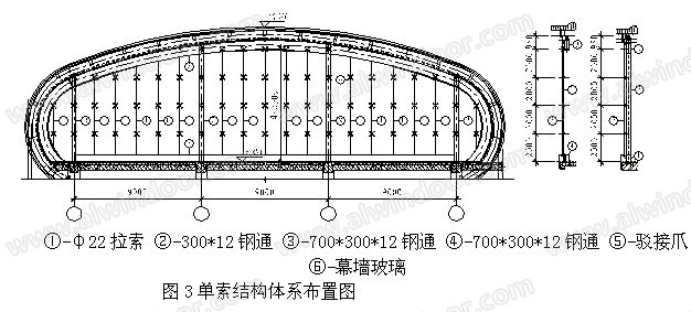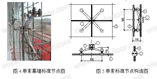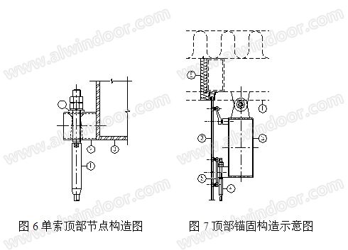為防止豎向單索在承受水平荷載變形時(shí)使頂部 ①-屋面鋼結(jié)構(gòu)②-箱形鋼梁③-幕墻玻璃錨固端頭螺桿與矩形方管產(chǎn)生扭曲,單拉索端頭調(diào) ④-拉索錨固端⑤-星形鋼板爪⑥-鋁單板節(jié)張拉裝置采用半球鉸機(jī)構(gòu),拉索固定錨固端螺桿 半球形夾具②-矩形方管通過半球鉸機(jī)構(gòu)在矩形方管內(nèi)內(nèi)沿垂直幕墻玻璃面有±5°的萬向旋轉(zhuǎn)自由度(如③-箱形鋼梁④-拉索錨固端圖7),來適應(yīng)單索幕墻的比較大的柔性變形。為防止半球鉸機(jī)構(gòu)在轉(zhuǎn)動(dòng)時(shí)產(chǎn)生金屬噪音,安裝半球鉸機(jī)構(gòu)時(shí)涂抹潤滑油。