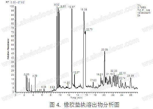 (2)各樣品主要成分分析:橡膠墊塊溶出物的氣質聯用分析結果見圖4。