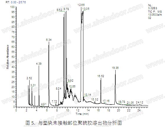 從圖5可以看出,中空玻璃與墊塊未接觸部位密封膠溶出物的主要成分為鄰苯二甲酸二丁酯(9.78周圍峰)、鄰苯二甲酸丁芐酯(12.66周圍峰)。從圖6可以看出,與墊塊接觸部位密封膠溶出物的主要成分為鄰苯二甲酸二丁酯(9.33周圍峰)、鄰苯二甲酸丁芐酯(12.67周圍峰)、鄰苯二甲酸二異辛酯(15.40周圍峰);與墊塊接觸部位密封膠的主要成分較其它兩處密封膠增加了墊塊中特有的鄰苯二甲酸二異辛酯等物質,可見此處密封膠已被墊塊污染。