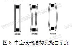 建筑環境溫度每天有一個峰值,每年有一個極大值,中空玻璃內氣壓將相應循環變化,密封腔內外氣體壓差作用于玻璃引起中空玻璃撓曲變形(圖8),邊緣密封膠產生拉應力并伸長變形,一旦粘結寬度較小,密封膠所受拉應力超出其粘結拉伸強度對應的極限,就會產生粘結失效現象。此外,水分從外界進入中空玻璃腔內的大小的影響因素主要是密封膠的氣體滲透系數、粘結寬度和空氣層內外的壓差。