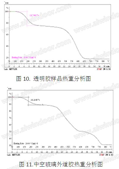 從圖中可以看出,透明膠樣品中低沸點物質(如白油等)含量較大,約占25%;中空玻璃外道膠也還含有了約11%的低沸點物質,更加證實了外道膠已被透明膠污染,這些低沸點物質透過外道膠進入丁基密封膠進而溶解了丁基密封膠,最終造成中空玻璃流淌的現象。