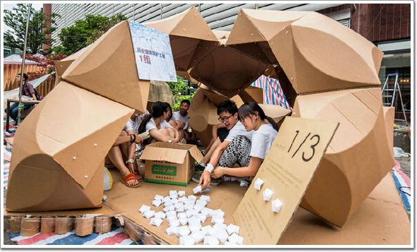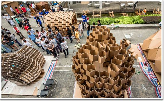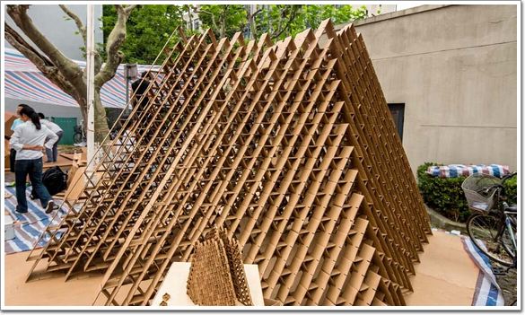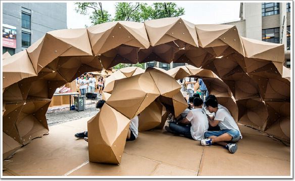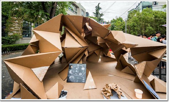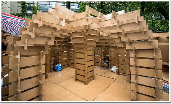 這是五個大一女生組成的團隊。設計充分發揮了紙板的特點,采用極為簡單的方式,塑造出極富變化的空間和光影效果。
