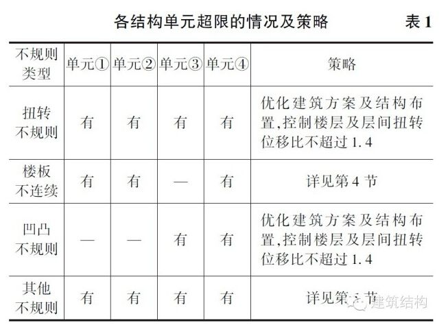 本工程各結構單元超限的情況及策略見表1。