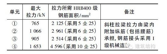 斜柱拉梁的拉力及配筋情況 表2
