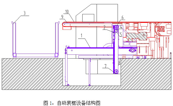 自動裝框設備的結構如下圖1所示,包括機架1、傳動系統一2、料框3、輸送臂9和鋸床輥道10;其中傳動系統一包括傳動軸4、齒輪一5、齒輪二6、齒輪三7和齒條8。下圖1所示的結構中傳動系統一在電動機的驅動下只是帶動輸送臂上下運動,在圖紙的垂直