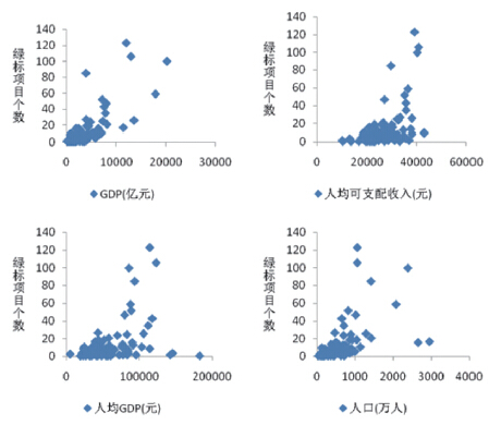 通過分析綠色建筑評價標識項目數(shù)量與宏觀經(jīng)濟因素的相關性(如圖7),了解我國綠色建筑評價標識工作與國民經(jīng)濟的關系。綠色建筑評價標識的項目數(shù)量與當?shù)谿DP的關系最為密切,其線性相關程度高于其他幾個因素,其次為當?shù)爻擎?zhèn)人均可支配收入,之后為當?shù)厝司鵊DP,最后為當?shù)厝丝凇>G色建筑評價標識項目數(shù)與國民經(jīng)濟的關系是:當?shù)谿DP越高、人均可支配收入、人均GDP越高和人口越多,獲得綠色建筑評價標識的項目數(shù)量越多。