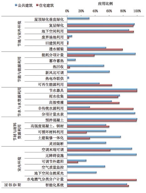 根據(jù)以往綠色建筑標識項目中提供了詳細技術應用數(shù)據(jù)的項目進行統(tǒng)計(其中,住宅建筑171項,公共建筑139項),對綠色建筑標識項目中的技術應用情況進行分析,如圖8。可以看出住宅類綠色建筑標識項目中,復層綠化、地下空間利用、節(jié)水器具、非傳統(tǒng)水源利用、預拌混凝土(詞條“混凝土”由行業(yè)大百科提供)、水電燃氣分類分戶計量等技術的使用率較高;舊建筑利用、廢棄場地利用、余熱利用、可調節(jié)外遮陽使用率較低;公共建筑綠色建筑標識項目中,復層綠化、能耗分項計量、節(jié)水器具、分項計量水表、預拌混凝土、空調末端可調、無障礙設施等技術的使用率較高,廢棄場地利用、舊建筑利用、蓄冷蓄熱、余熱利用、熱電冷聯(lián)供等技術使用率較低。