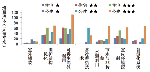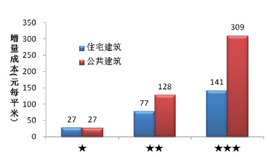 由上圖可看出,住宅建筑和公共建筑的單位面積增量成本均隨著星級的增高而增加,同時,一星級住宅與公建的單位面積增量成本相近,二星、三星級公共建筑的單位面積增量成本遠高于同星級住宅建筑。