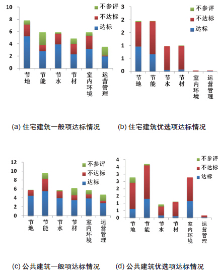 從上述圖中可以看出,我國住宅類標識項目一般項中,室內環(huán)境、節(jié)地、節(jié)水、節(jié)材部分不達標項數(shù)較高;優(yōu)選項中,節(jié)能、節(jié)地、節(jié)材、節(jié)水不達標項數(shù)較高,達標項數(shù)較高的為節(jié)地、節(jié)能部分。公建類標識項目一般項中,節(jié)能、節(jié)水、節(jié)地、節(jié)材不達標項數(shù)較高;優(yōu)選項中,節(jié)能、節(jié)地、室內環(huán)境不達標項數(shù)較高,但達標項數(shù)較高的也為節(jié)能、室內環(huán)境、節(jié)地部分。