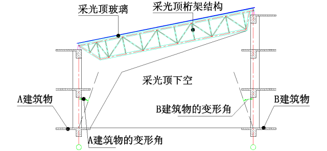 如圖5為跨越Ⅰ、Ⅱ兩段結構間的變形縫的采光頂,此處的采光頂的支撐結構應增設一根鋼梁或鋼柱,同時玻璃面板應完全分離,其縫隙不得小于25mm,同一塊玻璃嚴禁跨越變形縫。如圖6所示,工程中經常在兩建筑物之間增加采光頂,這兩建筑物有可能相互完全獨立,由基礎沉降、溫度變形或地震等因素引起的變形角則可能不同。因此橫跨于兩樓之上的采光頂,必須具有較強的自變形能力,以適應兩樓不完全一致的變形。通常的做法是支撐結構采用鉸支座或滑動支座,其變形角能吸收建筑物的變形差異;此處的面板應盡量采用金屬板,而不是玻璃。