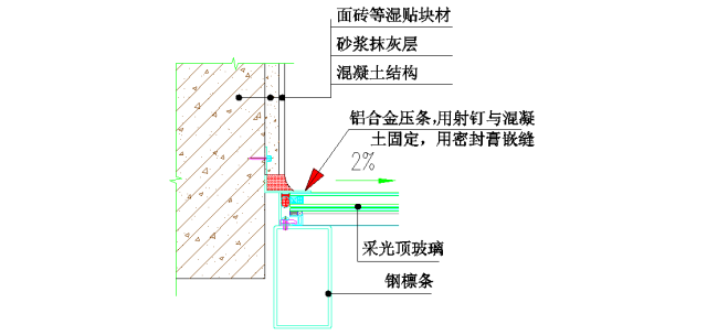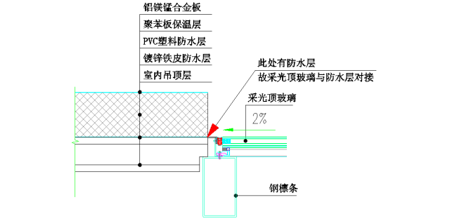 與采光頂接觸的界面可以有很多,如石材、面磚、砂漿抹灰(外刷涂料)、清水混凝土、鋁板、鋁鎂錳合金板、鋼板(排水槽處)、太陽能光電板等;其過渡交接的方式則有平接、搭接、插接等幾種方式。平接是兩種界面分別固定(詞條“固定”由行業大百科提供)在框上,通過密封膠或密封膠條過渡,其特點是順著流水坡度方向平滑順暢。平接過渡方式對設計和施工而言都比較簡單,不易出錯,但對密封膠的施工質量要求比較嚴格。搭接是順著水流方向,一種界面壓住另一種界面,這是一種古老的過渡方式,但遇到新材料時,卻不斷出現設計和施工問題。如圖8所示本人參與審查的某工程采光頂的節點圖。該采光頂的玻璃與金屬屋面板的下層鍍鋅鐵皮搭接,玻璃在上層,且順著水流方向,似乎沒錯。然而設計師卻未考慮到在鍍鋅鐵皮上還有保溫層和鋁鎂錳合金面板,反而玻璃在下面,成為倒排水。所以搭接應遵守的原則是“水往誰流,誰就在下”。并且壓住的面一定是與水接觸的面,切不可中間過度面。而插接方式一般使用在有較大結構應力位置,比如變形縫處,外側仍采用密封膠密封。