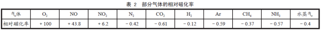 氧氣的磁化率比一般氣體的磁化率高出數(shù)百倍,混合氣體的磁化率幾乎完全取決于所含氧的多少。該方法利用氧氣的順磁性特質(zhì),根據(jù)混合氣體磁化率的大小來確定氧的含量,從而計算出混合氣體中惰性氣體的含量。部分氣體的相對磁化率見表 2。