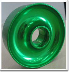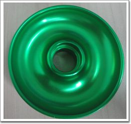按照表1和表2中鋁合金成分進行配料、鑄棒,在相同的工藝條件下擠壓生產成φ81的擠壓棒材,然后機加工,外徑車削到φ80,端面用成型刀具加工成輪轂形狀,中心打通孔 φ17,鏜孔到φ17.5。加工好的半成品再進行染色陽極氧化(詞條“氧化”由行業大百科提供),氧化工藝與其它料的區別在于前處理只做酸洗除油不進行堿蝕,因為堿蝕后金屬表面的自然光澤就會消失,導致表面產生霧狀的效果,不光亮。