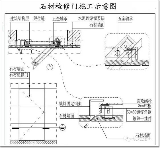 (1)石材暗門需采用熱鍍鋅角剛,角鋼大小及滾珠軸承大小根據門體的自重選定,焊接部位作防銹處理。