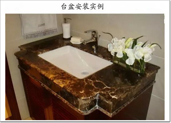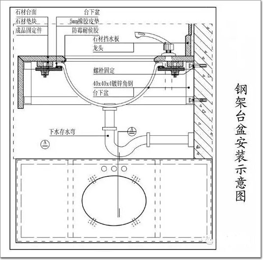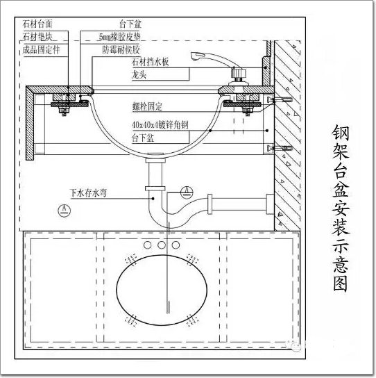 (2)臺盆固定于固定構件上,固定構建與石材墊塊用不銹鋼或鍍鋅螺栓固定,墊塊背面及臺面粘結部位需經打毛處理用大理石膠粘接固定,臺盆與固定構件連接處需用橡皮墊塊,臺盆與臺面板下沿口用耐候膠密封。