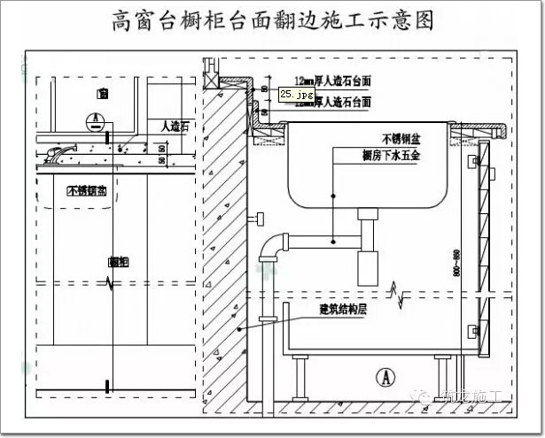 (1)窗臺部位低于人造石臺面板,人造石臺面擋水做出后需跟至窗邊或預留。