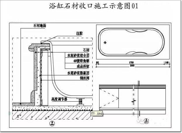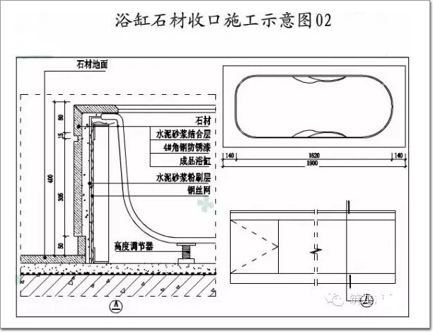 (2)浴缸周邊石材部位作4*4鍍鋅角鋼支撐架,鋼絲網泥沙漿粉刷(詞條“粉刷”由行業大百科提供)后再安裝石材,并留設石材檢修暗門,檢修門規格及方向需符合檢修要求。