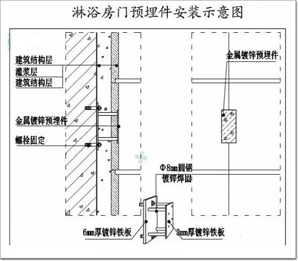 8、淋浴房門預埋件安裝:在石材安裝前預埋鐵桿,直接與墻體固定(砂加氣墻需采用對穿螺絲桿加固)。