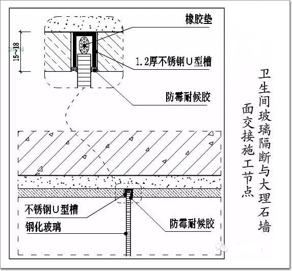 7、衛生間玻璃隔斷(詞條“玻璃隔斷”由行業大百科提供)與大理石墻面交接施工節點: