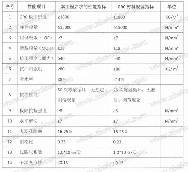由于國家尚未頒布專用于幕墻行業的GRC材料行業技術規程及國家標準,目前市場上的GRC產品采用《玻璃纖維增強水泥外墻板》JC/T1057-2007、《玻璃纖維增強水泥(GRC)裝飾制品》JC/T940-2004標準,性能指標并不能完全匹配于建筑外墻,這極大地限制了此類新型材料的大規模應用。本工程作為國內外響當當的標志性建筑,對于建筑外墻的GRC材料性能指標參數需要有較高的要求,下表為本工程參照其他材料規范提出的GRC性能指標參數表。