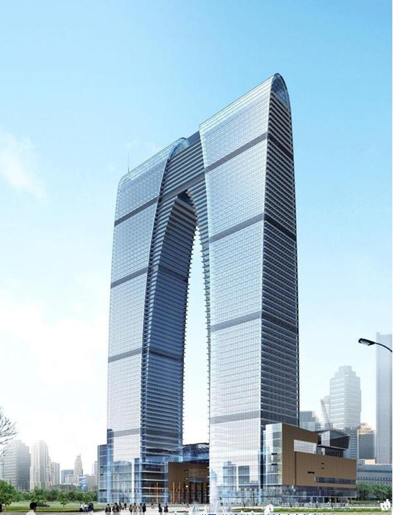 東方之門樓高301,8m,總建筑面積約460000m。整個(gè)建筑由南北塔樓和裙樓構(gòu)成,兩座塔樓在頂部相通,成為一體,其外形如同一座大門。300m高度的“門”形外觀既表達(dá)了獨(dú)特的古典神韻又體現(xiàn)了高超的現(xiàn)代科技;同時(shí)它標(biāo)志著CBD軸線的起始,又將空間向金雞湖作了延伸。