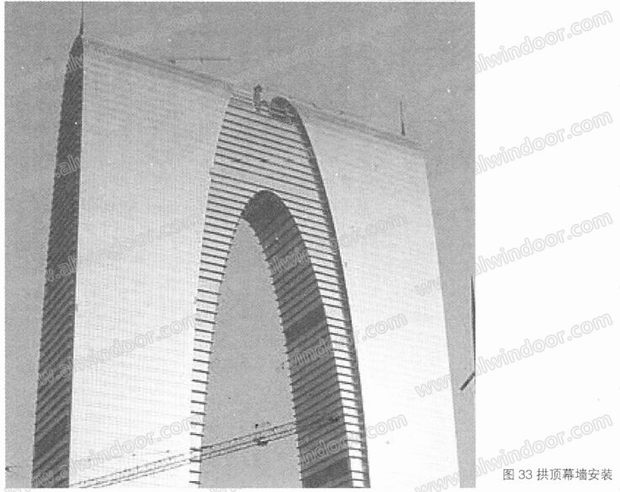 本系統位于南、北塔樓連接部位(標高:225,85m),施工面較高、下部無樓體結構,通過搭建工作平臺,在其施工面的下方安裝輔助鋼支撐,鋼支撐上鋪設木板的方式進行幕墻的安裝工作外圍護做全封閉安全網,以確保施工安全。拱底也配置了特殊擦窗系統。