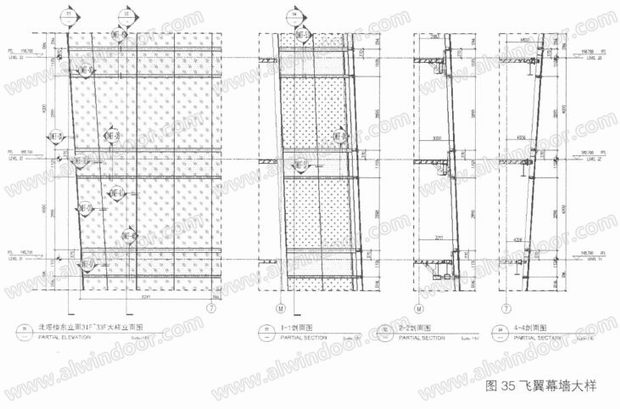 10超白+12A+8雙銀Low-E鋼化中空玻璃,其他位置玻璃同相鄰幕墻系統主塔樓東西面與南北轉折的位置均有外挑的玻璃飛翼,而與內拱面傾斜面交接的飛翼難度更大;南北轉角位置均有內凹的建筑細部,平面看均是陰陽角接連轉折的,而與內拱面傾斜面交接的陰陽角(詞條“陽角”由行業大百科提供)因兩面均帶斜度難度更大,如何滿足幕墻的安全性又能利于安裝就位是設計的關鍵。