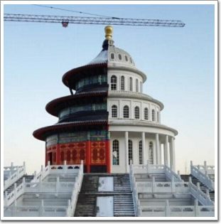 這座中西復合體建筑物,由西式大廈和祈年殿結合而成。南面為西式大廈,有四層之高,其頂層為圓頂,氣勢宏偉、美輪美奐;北面為祈年殿,有三層之高,由西式大廈方向看過去,祈年殿三層檐口有一半漏出,由祈年殿方向看過去,西式大廈圓屋頂有兩塊樹葉外形出露,中西復合體是全球獨一無二的復合建筑。