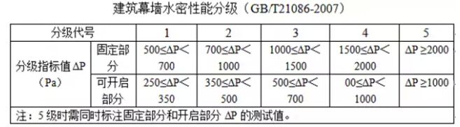 1、 雨水滲透性能系指在風雨同時作用下,幕墻防止雨水滲漏的能力。因我國地區氣候差異較大,根據不同的氣候條件我們在確保幕墻不發生雨水滲漏的前提下把室內外空氣壓力差作為幕墻防雨水滲漏性能的衡量指標,并按幕墻固定部分和開啟部分分開制定分級標準。