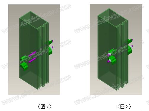 在立柱上橫梁連接位置加工出上下兩個孔,兩孔關(guān)于分格中心線對稱,將四個轉(zhuǎn)扣通過螺柱組件安裝于立柱兩側(cè)(見圖7、圖8)。