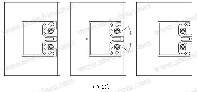 立柱安裝調(diào)試完畢后,將橫梁由室內(nèi)方向往外平推,使其槽口卡入轉(zhuǎn)扣中,并同時轉(zhuǎn)動轉(zhuǎn)扣將橫梁卡住。(見圖9、圖10、圖11)。