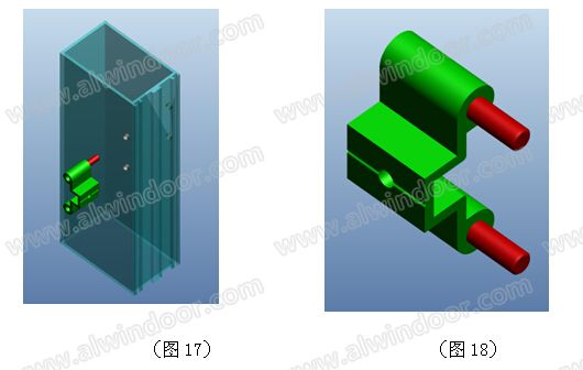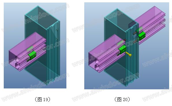 將銷釘組件在立柱上試安裝,直觀的感受銷釘與銷孔配合的情況。銷釘組件為一段鋁型材和兩顆銷釘組裝而成(見圖18),將銷釘組件滑入橫梁的滑槽中(見圖19)。將橫梁置于立柱之間、滑動銷釘組件使銷釘插入立柱上的銷孔中(見圖20)。最后使用自攻釘將銷釘組件固定在橫梁端頭,自攻釘可以是一個或多個,有輔助受力的功能。