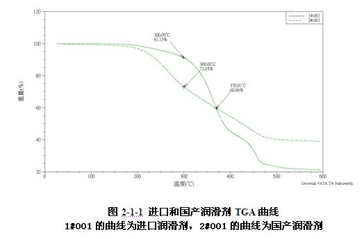 國產潤滑劑的主組份在200°C——300°C之間的衰退明顯,質量約占25%;第二組份在300°C——450°C之間,質量約占35%,該組份降解的速度與溫度成線性關系;不能降解的固體物質質量約占40%。