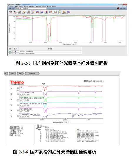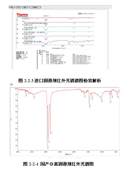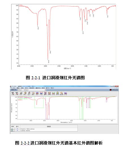 刮下少量進口和國產潤滑劑粉末,與 KBr 粉末研磨(詞條“研磨”由行業大百科提供),壓片,用透射法測試,得到其紅外光譜圖[4]。對比進口和國產潤滑劑的紅外光譜圖,發現進口潤滑劑有10個特征峰,國產潤滑劑有11個特征峰;特征峰的數量相當;而且在2918 cmP-1P 、2848 cmP-1P 、1637 cmP-1P、1470 cmP-1P 、1378 cmP-1P 和719 cmP-1P 6個波長位置都出現了特征峰,兩個潤滑劑存在大量相同的基團 。其中2918 cmP-1P可能是CHR2R反對稱伸展振動,2848 cmP-1P可能是CHR2R對稱伸展振動;1470 cmP-1P可能是CHR3R反對稱變形(詞條“變形”由行業大百科提供)振動,、1378 cmP-1P可能是CHR3R反對稱變形振動;719 cmP-1P可能是(CHR2R)Rn>4R平面搖擺振動特征峰。由此可以看出,進口潤滑劑和國產潤滑劑配方基本官能團組成相似度極高。