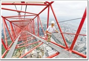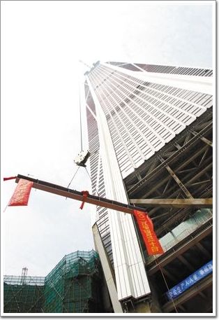 據(jù)了解,2014年7月,平安金融中心超越京基100成深圳第一高樓,該建筑主體結(jié)構(gòu)采用“巨型框架-核心筒-外伸臂”結(jié)構(gòu),地下工程5層,地上118層,建筑面積達49萬平方米,該樓建成后總高度將達到近600米,成為深圳新的地標(biāo)。站在平安金融大廈樓頂?shù)目罩衅脚_,手機自動轉(zhuǎn)接到了香港的信號。在550多米的高度,云霧不時在塔吊上方飄浮,耳邊的風(fēng)不停地呼嘯而過,偶爾會產(chǎn)生一陣風(fēng)刮來腳底就站不穩(wěn)的錯覺。