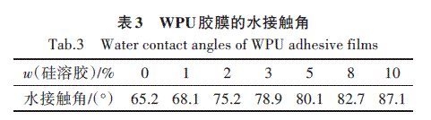液體在固體表面上的接觸角可判斷液體對固體的潤濕性能,材料表面水接觸角的大小基本上反映了其疏水性的大小[7]。對同種液體而言,液體在固體表面的接觸角越大,其對固體的潤濕性也就越差。表3 列出了室溫(25 ℃)時硅溶膠摻量對WPU膠膜水接觸角的影響。