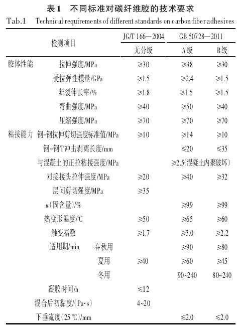 由于GB 50367—2013[16]于2014年6月起實施,并且關于碳纖維膠在設計上的技術要求以GB 50728—2011 為準,故本研究主要對比行標JG/T 166—2004和國標GB 50728—2011 中對混凝土結構加固用碳纖維膠的技術要求,具體技術要求如表1所示。
