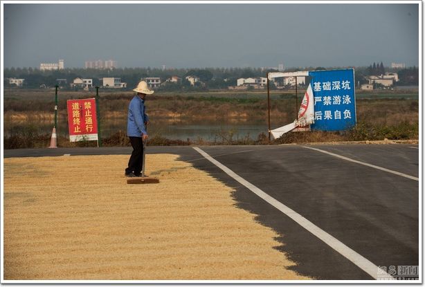 2014年10月18日,湖南長沙當地的一位農民在專門為“遠大天空城市”項目修的望湖路上晾曬稻谷。這條路西起金星路,東抵規劃中的大澤湖路,長度為370米(已建成280米),寬30米,投資額為1200萬(含900萬征拆費用)。