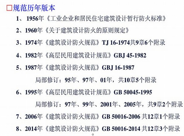 2014版共425條,其中強制性條文165條,約占總條文的39% 。新增條文69條、修改128條、刪除114條。新增第7章“滅火救援設施”、第8章“消防設施的設置和第11章“木結構建筑”和附錄A、B。刪除原建規第6、8、9三章。