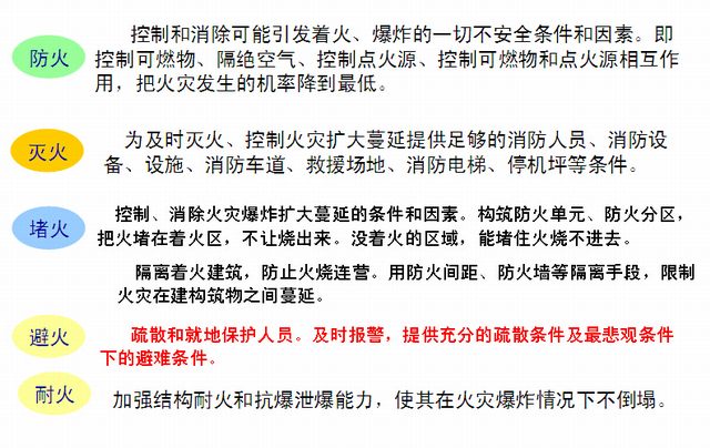 避火---即逃生,疏散和避難。既要作好疏散的準備,并保證疏散避難設施的安全(防火、防煙、防塌),還要為早疏散,早逃生,早避難作好準備(設火災報警、應急廣播、應急照明、疏散指示標志)。