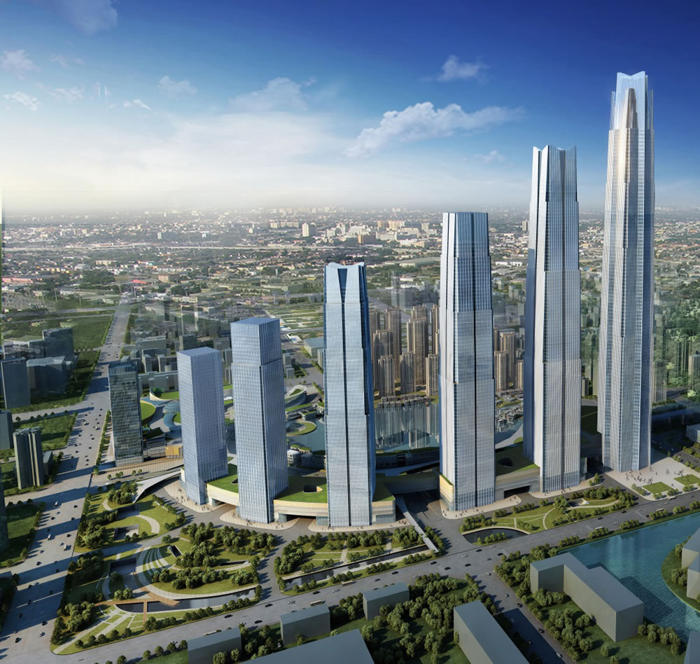 寶能環球金融中心,傲立于300萬方城市綜合體寶能城之上,由7棟超高層摩天建筑集群林立而成,其中單棟最高約565米,問鼎安徽第一高,躋身世界超高建筑前十,