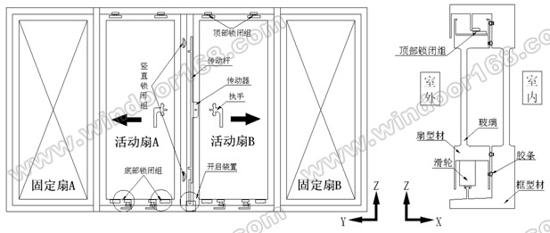 五金系統配件的種類中,執手、傳動器與方案一不同,均采用雙行程結構,在活動扇B的底部靠近活動扇A的部位還增加一個開啟裝置,且與傳動器連接,用于引導兩扇的開啟順序。