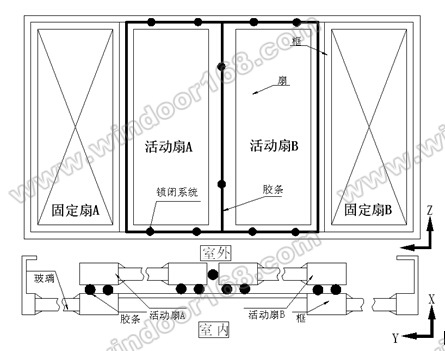 方案二系統如圖8所示,是一種4扇結構推拉系統,包含兩個固定扇A和B,兩活動扇A和B。該系統可以理解為將兩個方案一系統進行了對稱布置,這樣的布局符合中國人們喜歡對稱美的要求。與方案一相比,該方案的五金系統和密封方式有所不同。