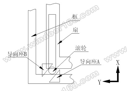 該系統中的開啟裝置如圖10所示意,開啟裝置由兩部分組成,分別為安裝在框上的導向座A、B和安裝在扇上的滾輪,滾輪與傳動器連接。系統關閉時,轉動執手至最大行程,滾輪將與導向座A接觸,導向座A將迫使滾輪帶動活動扇B沿Y方向運動(配合豎直鎖閉組同步進行),直至活動扇B運動到鎖閉位置;系統開啟時,反向操作執手至第一個行程結束,滾輪將保持不動,此時活動扇B也保持不動并將活動扇A彈開,再操作執手至第二個行程結束,此時滾輪將退出導向座A并與導向座B接觸。導向座B迫使滾輪帶著活動扇B沿Y方向反向運動,并將活動扇B相對于框推開一定的距離,消除框扇之間的摩擦力,便于開啟順暢。