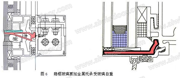 結(jié)構(gòu)密封膠(詞條“結(jié)構(gòu)密封膠”由行業(yè)大百科提供)不宜長(zhǎng)期受力,隱框板塊必須底部加托承受玻璃自重。中空板塊的底托要托住外玻璃(圖6)。