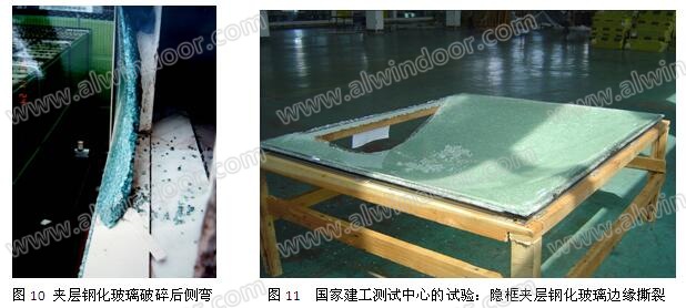 目前夾層玻璃大多采用PVB膠片作為中間層,這種膠片比較柔軟,強(qiáng)度低,一旦鋼化玻璃碎成粒狀后就失去后期強(qiáng)度,整片玻璃板塊發(fā)生大的平面外變形,下垂或外突。變形過(guò)大,玻璃板塊就會(huì)從金屬框中拔出,或沿附框(詞條“附框”由行業(yè)大百科提供)邊緣撕開(kāi),很容易整塊墜落(圖10、圖11)。