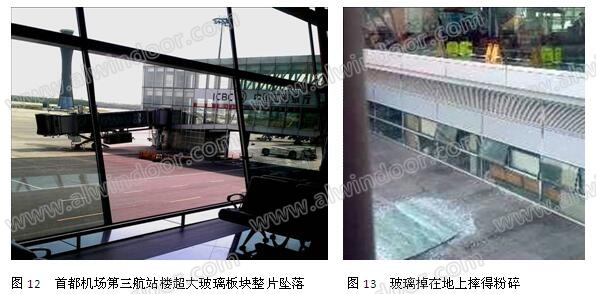 2012年5月25日,首都機(jī)場(chǎng)第三航站樓E區(qū)候機(jī)廳一塊2.4mX3.2m,面積約8㎡的夾層中空玻璃突然掉下,在地面上摔得粉碎(圖12、圖13)。玻璃為(10mm+2.24PVB+10mm)+12A+12mm,三片玻璃全鋼化,上下對(duì)邊明框支承,左右兩邊自由無(wú)支承,注膠(詞條“注膠”由行業(yè)大百科提供)密封。由于玻璃幕墻向外傾斜,板塊尺寸過(guò)大,一旦玻璃自爆,玻璃的自重將使夾層玻璃彎曲下垂,從槽口中拔出,整片掉下。