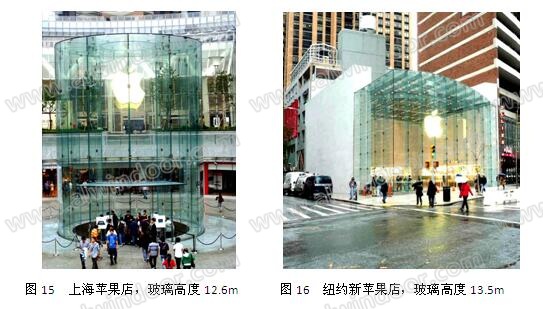 蘋(píng)果上海店用了12塊超白夾膠熱彎鋼化玻璃,12.6mX2.6m。采用三片12mm鋼化玻璃,SGP膜,膜厚度為1.54mm。國(guó)內(nèi)原片,北玻合片,每片玻璃價(jià)格約RMB100萬(wàn)元。而2011年新紐約蘋(píng)果店建成,玻璃高度13.5米,北京生產(chǎn)后,專(zhuān)機(jī)空運(yùn)紐約安裝(圖15、圖16)。
