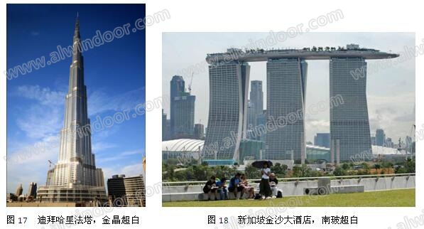世界最高建筑—迪拜哈里法塔,高度為828m,采用夾層中空超白玻璃,10 萬(wàn)㎡玻璃幕墻的超白玻璃由中國(guó)供應(yīng)(圖17)。
