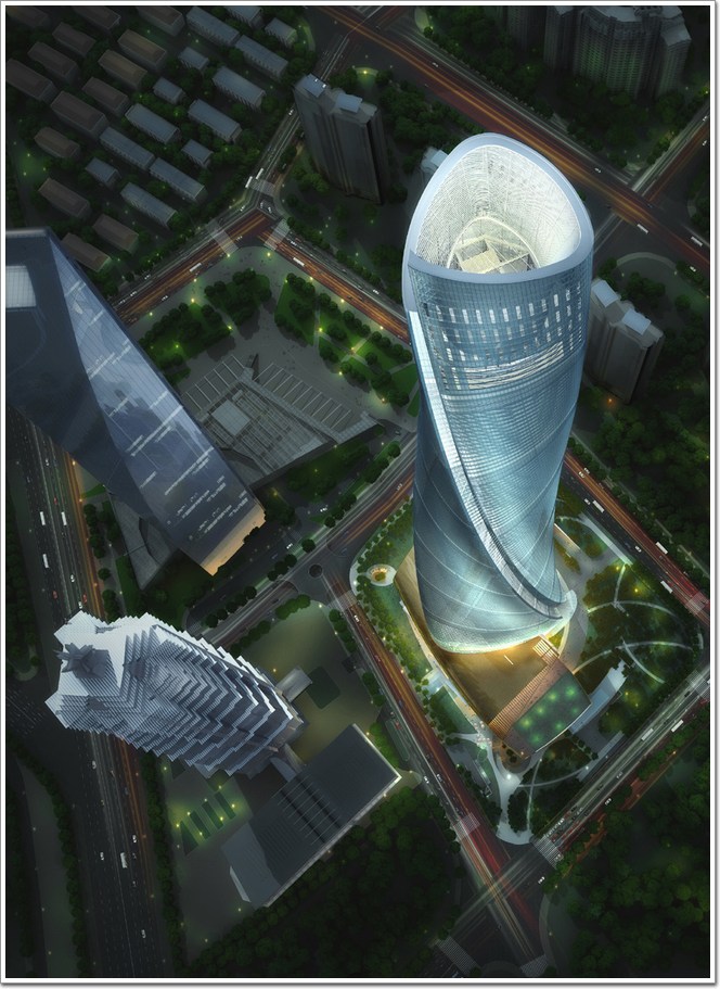 上海中心大廈建筑外觀呈螺旋式上升,建筑表面的開口由底部旋轉貫穿至頂部,與金茂大廈經典雋永的塔形和環球金融中心簡潔明快的立體造型形成鮮明對比。從天空向下俯瞰,上海中心大廈非對稱的頂部卷折狀造型,與金茂的點狀和環球金融中心的線狀頂部遙相輝應。項目包括一個地下5層的地庫;1幢約121層高的綜合樓(其中包括辦公和酒店),1幢5層高的商業裙樓,并有相應的配套設施。
